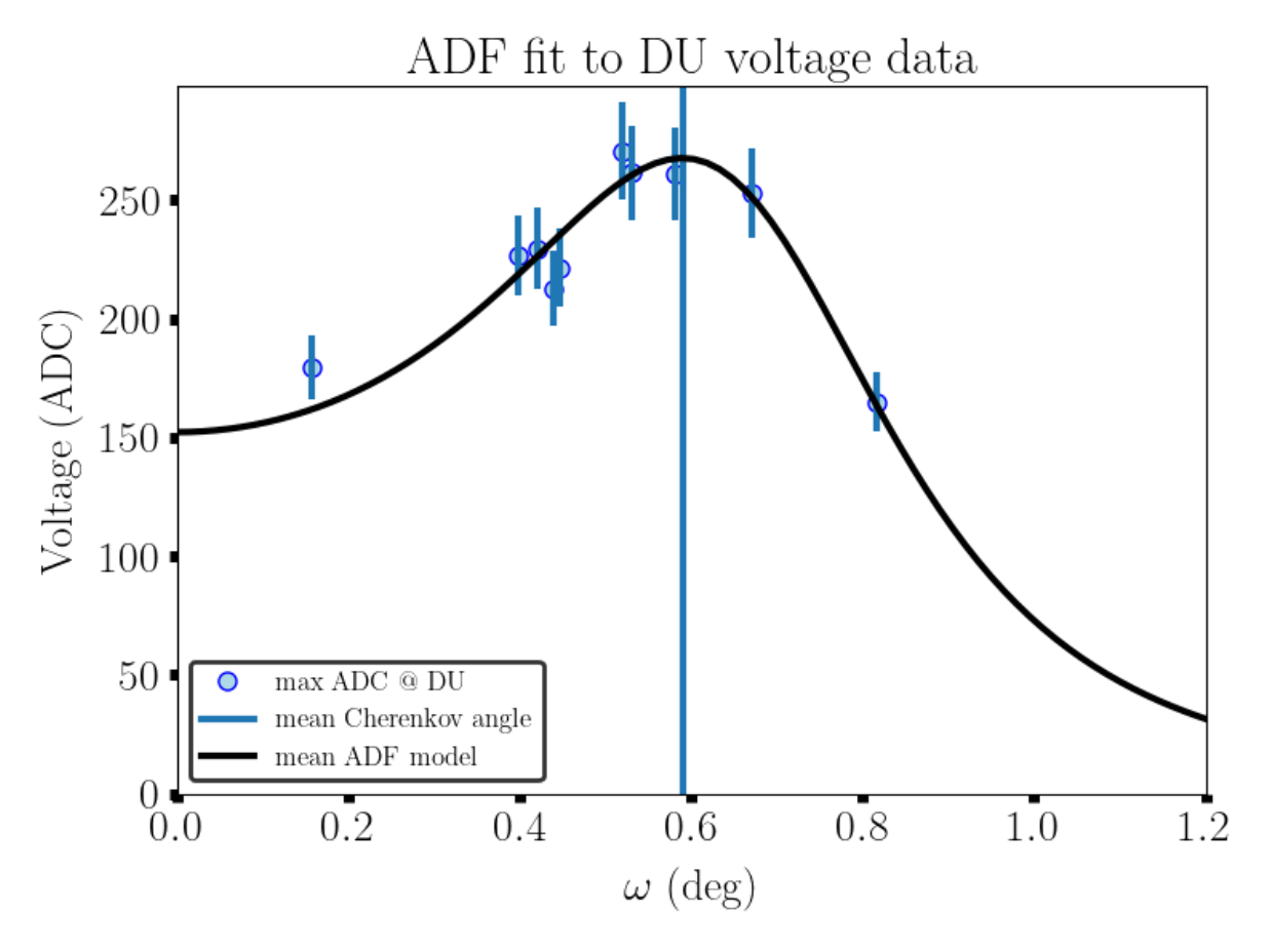 Fig 1 : Amplitude du signal radio en fonction de la distance angulaire à l’axe reconstruit de la gerbe pour l’un des événements identifiés comme une gerbe atmosphérique dans les données de GRANDProto300. La distribution des amplitudes des antennes (cercles bleus) suit la distribution attendue pour un rayon cosmique (courbe noire), avec une nette amplification du signal autour de la angle Cherenkov. Figure par Marion Guelfand.