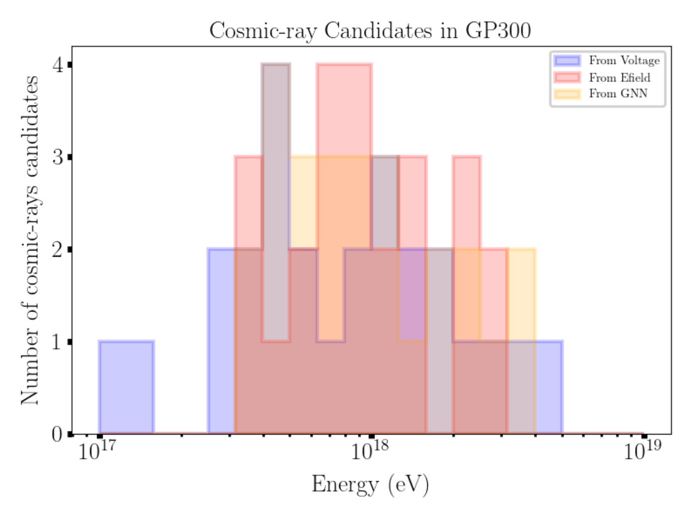 Figure 2 : distribution en amplitudes des 29 candidats de rayons cosmiques identifiés dans les données du détécteur GRANDProto300 entre Janvier et Mars 2025 pour les 3 analyses conduites au sein de la collaboration, dont celles de M. Guelfand [5] et A. Ferrière [6], doctorats au LPNHE. Figure par O. Martineau.